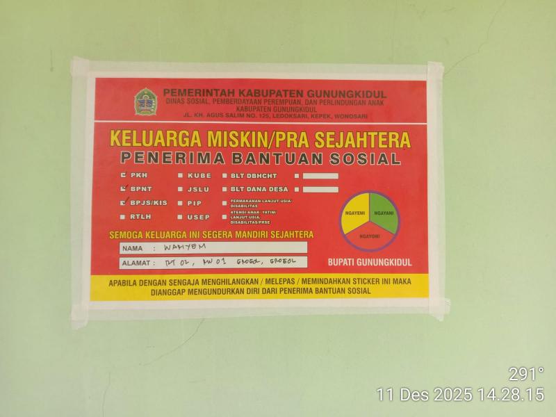 Grogol (Sida Samekta,15 Desember 2025). Menindak lanjuti Surat Edaran Bupati Gunungkidul Nomor 67 tahun 2025 tentang Pemasangan Sticker Keluarga Miskin/Prasejahtera Penerima Bansos, maka Pemerintah Kapanewon Paliyan mengadakan pemasangan serentak sticker di masing-masing Kalurahan pada hari Kamis, 11 Desember 2025. Forkompinkap bersama pendamping PKH, dipimpin langsung oleh Panewu Paliyan melakukan pemasangan sticker dilakukan pada rumah-rumah yang memenuhi kriteria sebagai sampel per Kalurahan 3 lokasi dimulai dari Kalurahan Karangduwet dan terakhir Kalurahan Grogol.